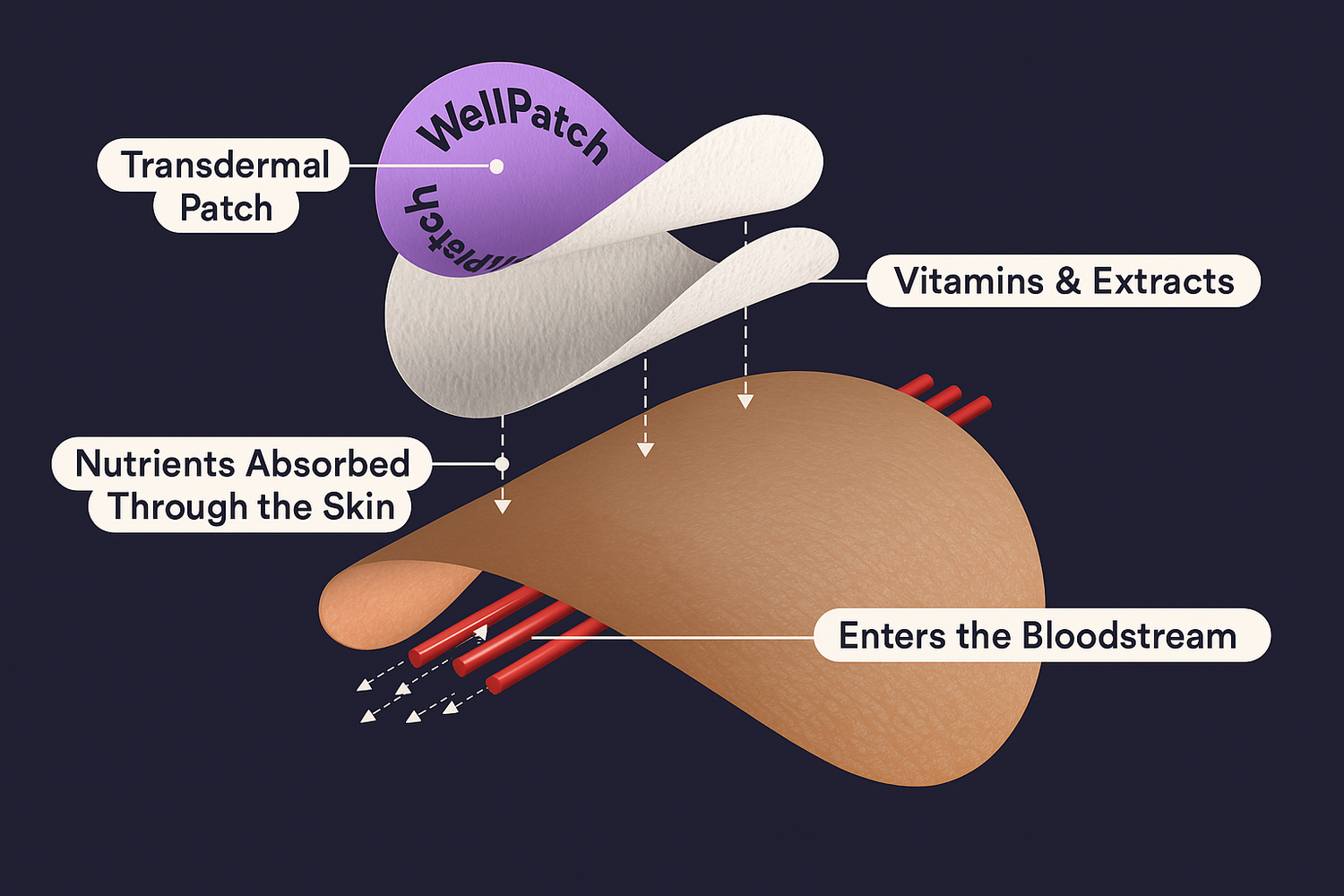 Our patches use transdermal delivery, a method that allows ingredients to be absorbed through the skin directly into the bloodstream.